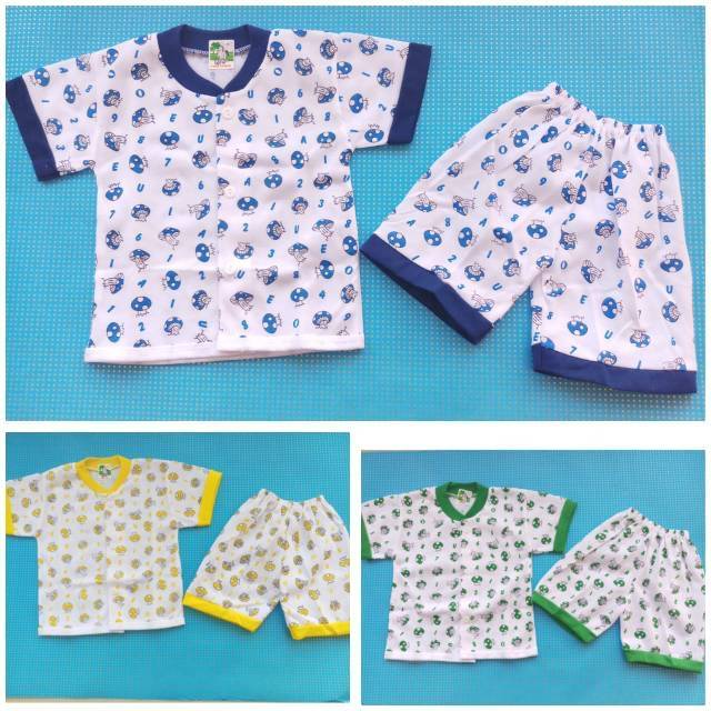 Stelan baju tidur bayi untuk newborn Kancing LD: 27 CM PJ BAJU : 33 CM PJ CELANA :25 CM LINGKAR PINGGANG ; 29 CM