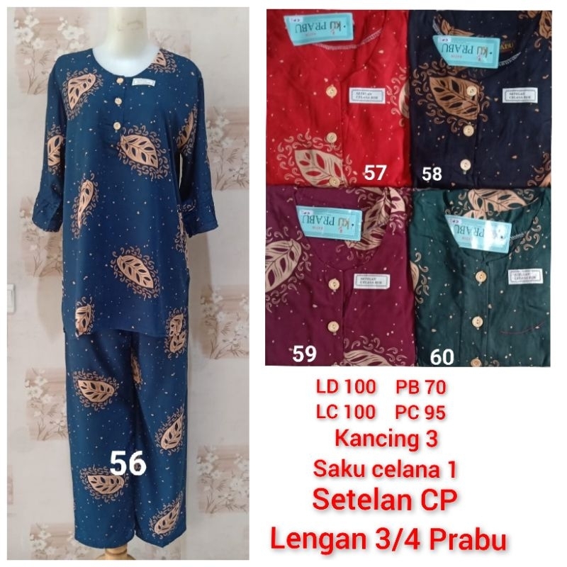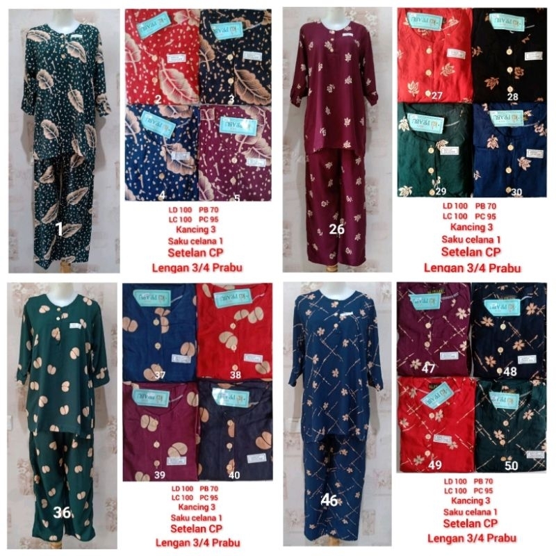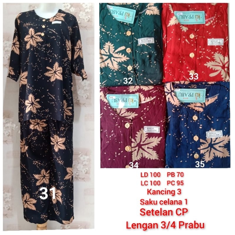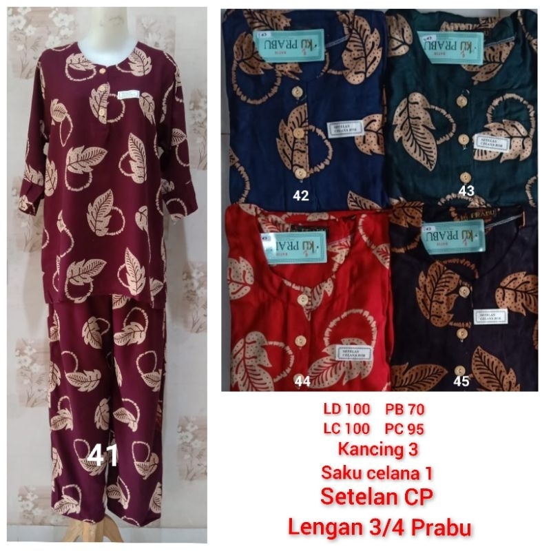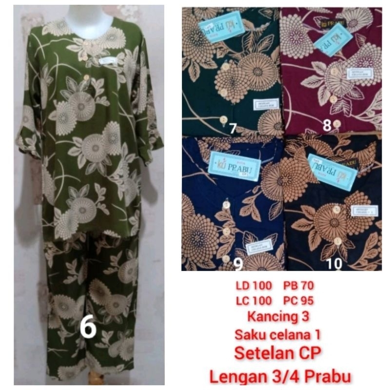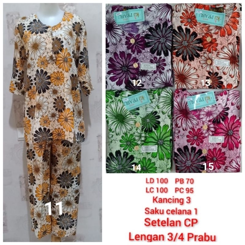 Setelan CP Lengan 3/4 Kencana Ungu label Prabu Bahan katun Lingkar dada 100 cm Lingkar celana/ pinggang 100 cm Lengan 3/4 (model Lengan rempel) Lingkar paha 60 cm Stok ready sesuai varian yang bisa di klik, silakan langsung order. Bila pilihan kosong akan dihubungi.