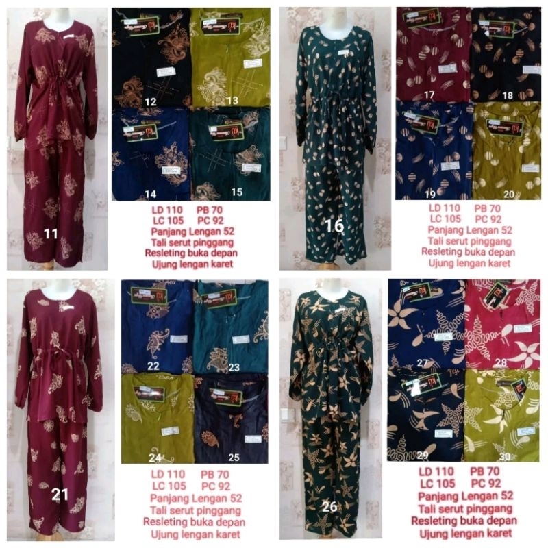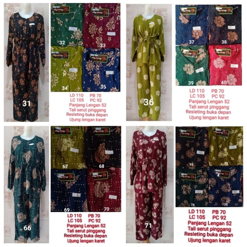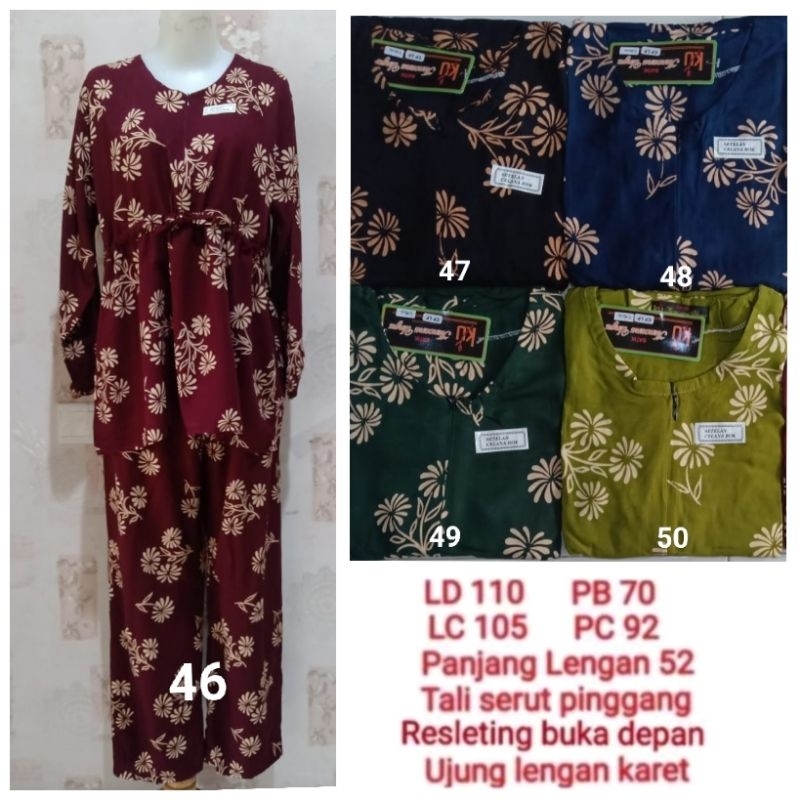 Setelan CP lengan panjang TD Kencana Ungu Label Hitam Bahan rayon Shantung LD 110 cm PB 70 cm Panjang Lengan 52 cm Lengan pakai karet di ujung Lingkar Paha 60 cm Serut tali di pinggang