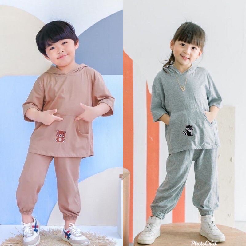 Setelan hoodie untuk anak laki-laki dan perempuan. Berbahan Katun Combed 30S, bahan adem, nyaman, menyerap keringat dan tidak panas saat dipakai anak. Accesories saku hidup diaplikasikan dengan patch bergambar animal simple tapi tetap lucu untuk anak-anak. Bagian celana karet pinggang sehingga tidak sakit saat di pakai.