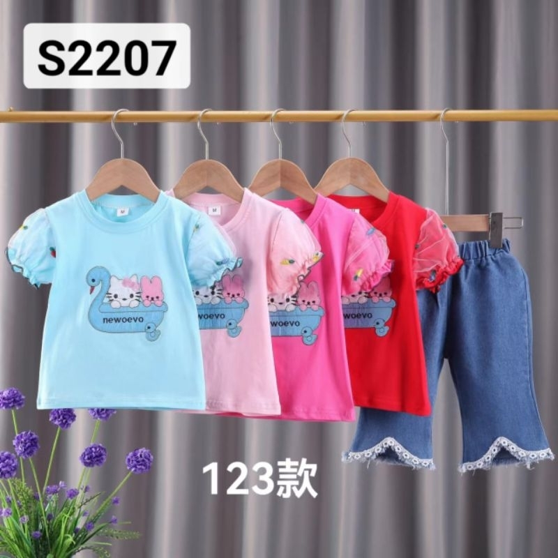 Fashion Bayi & Anak > Pakaian Anak Perempuan > Jas & Setelan > setelan Jeans Anak termurah Set Kaos Ruffle dan Celana Jeans Import 1-4 Tahun Setelan anak perempuan Import