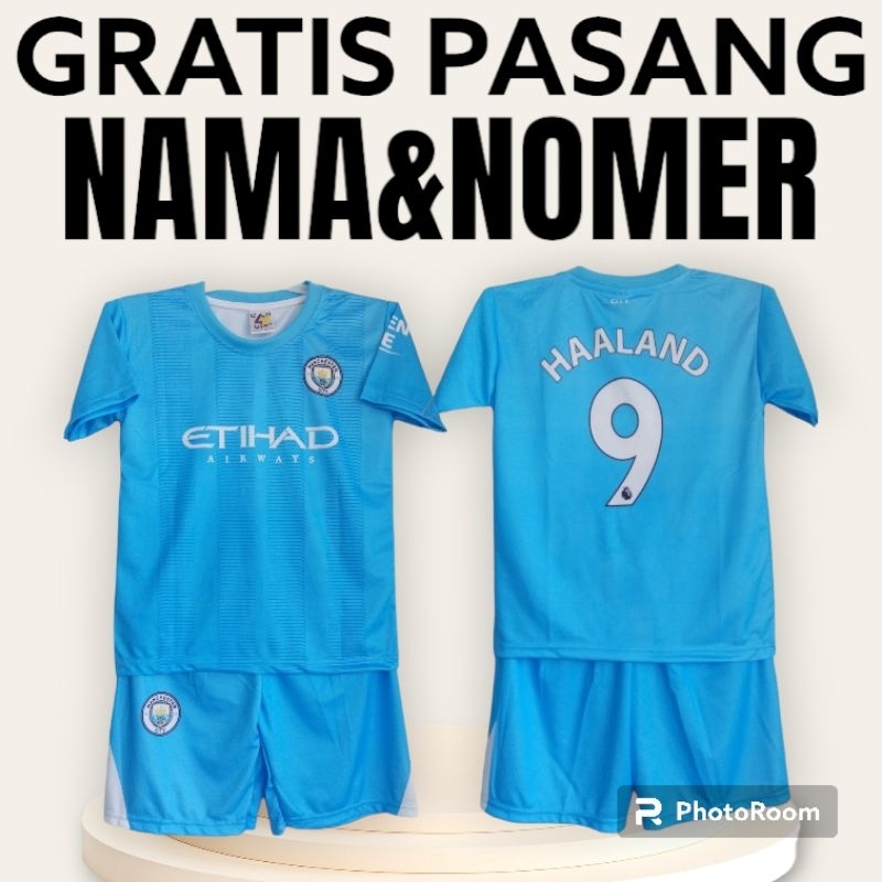 setelan Jersey M.CITY HAALAND/SETELAN BAJU BOLA ANAK LAKI LAKI/GRATIS SABLON NAMA DAN NOMER PUNGGUNG JERSEY M.CITY SIZE XL UMUR 10-11 THN