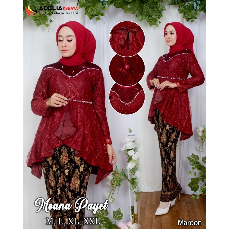 SET KEBAYA MOANA PAYET MATERIAL = ⢠BAHAN KEBAYA : TULLE LAPIS SATIN ⢠CRA BULAT ⢠DILENGKAPI PAYET MUTIARA ⢠TAPI PINGGANG ⢠SIZE : LD (lingkar dada) M : 98 L : 102 XL. : 108 XXL : 116