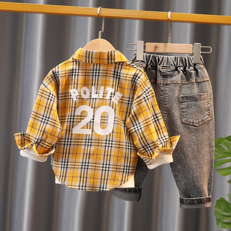 Setelan Fashion Pakaian anak Import (3pcs) : - 1pc Kemeja Katun Lengan panjang - 1pc Kaos katun Lengan Panjang (bisa melar) - 1pc Celana jeans panjang - pinggang full karet Import Quality - 100% baru