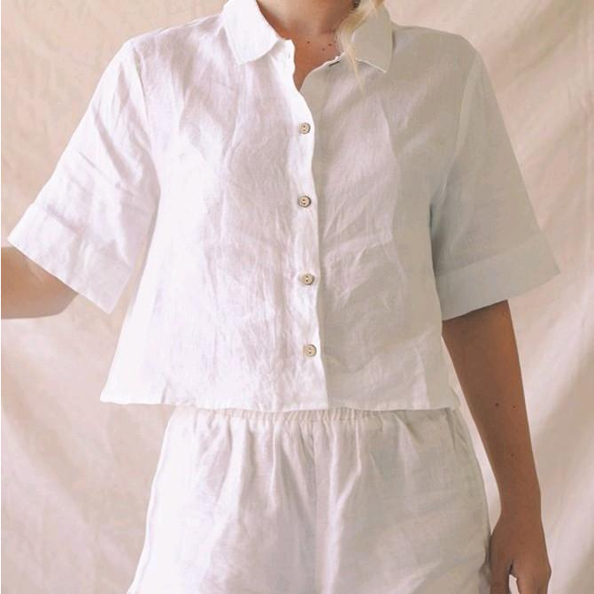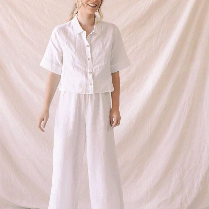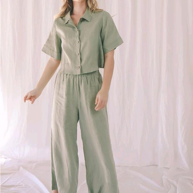 Detail Setelan kemeja crop polos tangan pendek dengan celana panjang Polos