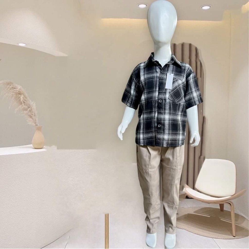 Setelan kemeja flanel dan celana chinos warna cream bahan katun usia 1 sampai 12 tahu// celan chinos/ kemeja flanel// baju lebaran//setelan kemeja koatk-kotak