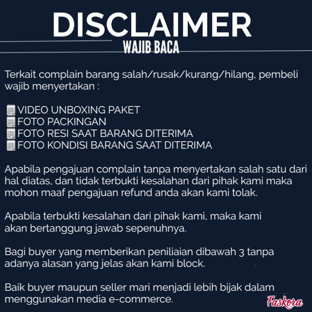 NB : Mohon Tanyakan Stok Terlebih Dahulu Pesan yang masuk akan dibalas di jam kerja. Warna & ukuran produk wajib dibuat di dalam keterangan invoice order. Invoice tanpa keterangan warna atau ukuran akan dikirim random sesuai stock yang tersedia.
