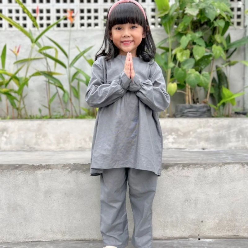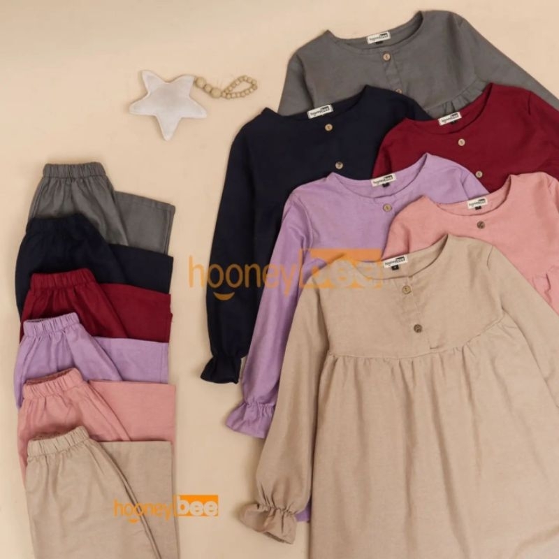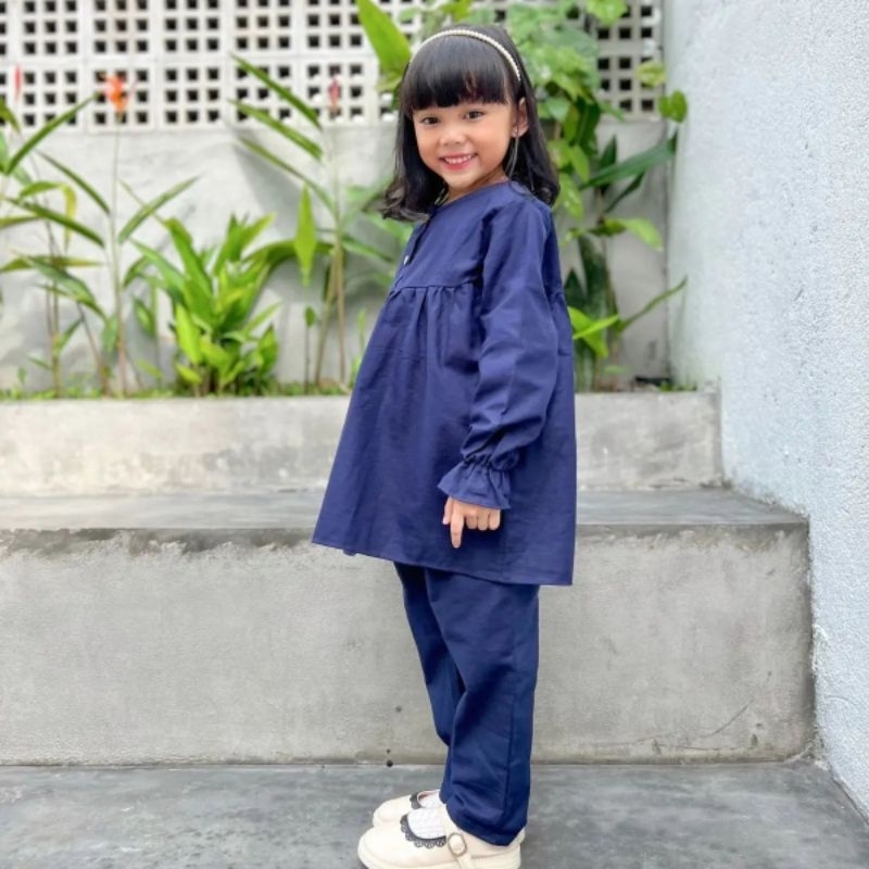 Setelan anak cewek,cocok di buat bepergian,bahan linance nyaman di pakai tidak mudah gerah,ada motif kancing di bagian dada,dan model kerut di bagian lengan.