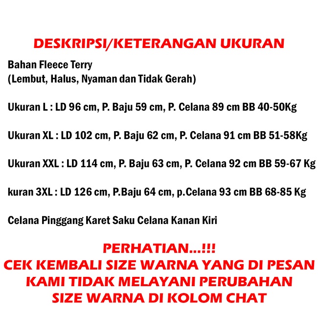 Ukuran XL : LD 102 cm, P. Baju 62 cm, P. Celana 91 cm BB 51-58Kg