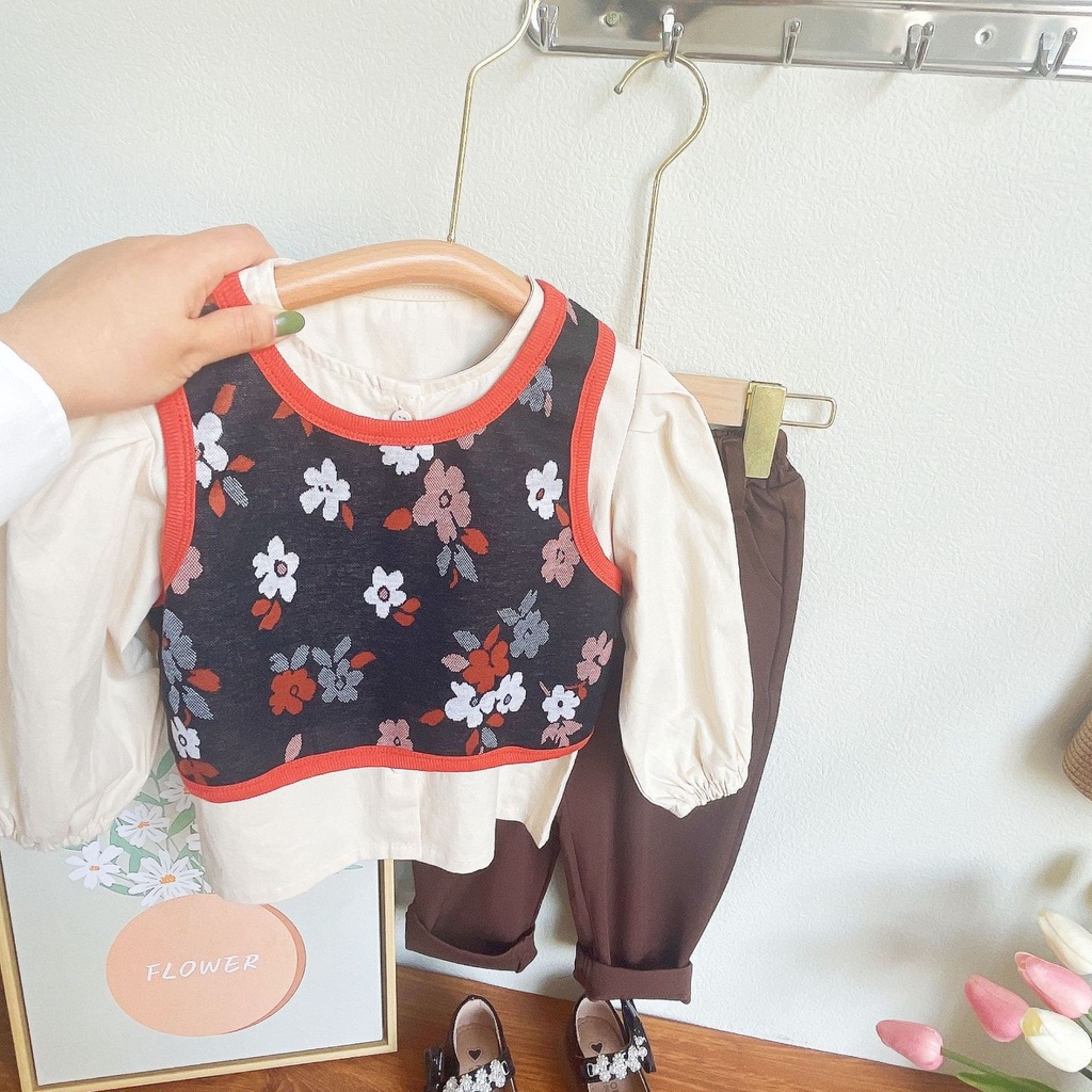 Setelan Panjang 3 IN 1 Anak Perempuan Korean Style Model Rompi Floret Oren Biru