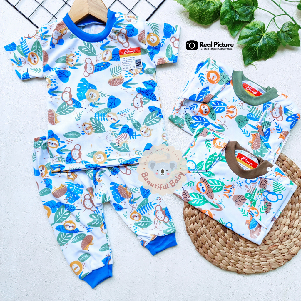 Detail Setelan Piyama Baju Bayi Usia 3-18 Bulan Motif Monkey Monstera / Baju Tidur Bayi Lengan Pendek Celana Panjang Kaos Oblong Kancing Pundak Bayi dan Anak - Baby.ou