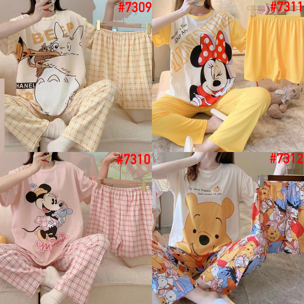 Produk: Setelan baju tidur piyama karakter 3in1 (atasan lengan pendek + celana panjang + celana pendek)