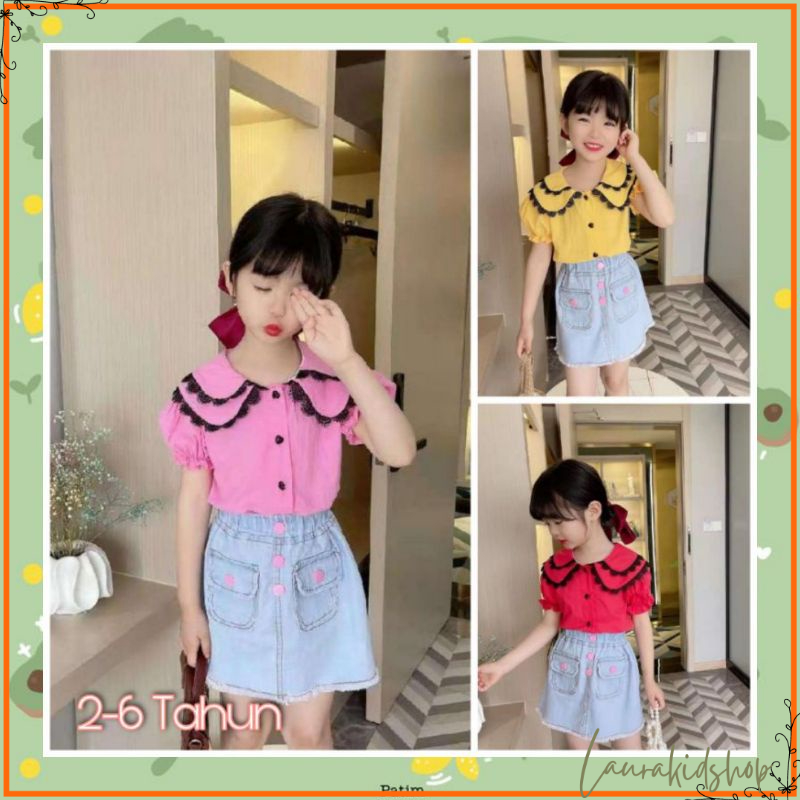 Detail Setelan Rok Anak Perempuan Import Premium Two Renda Bars Denim 2-6 Tahun
