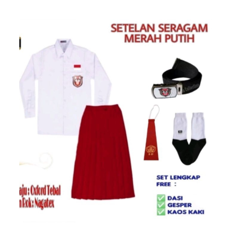 * Baju putih sd Panjang * Rok rempel merah Panjang * Sabuk * Dasi * kaos kaki * topi merah putih
