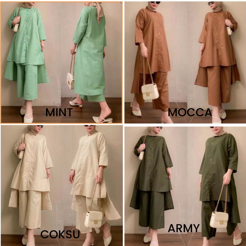 🌻DETAIL PRODUK - Pinggang Full Karet - Kancing Aktif - Model baju set atasan dan bawahan (Celana) - Panjang tangan 3/4 - Model baju depan pendek belakang panjang - Model Celana Kulot Panjang - Model Baju Kemeja Kancing Aktif