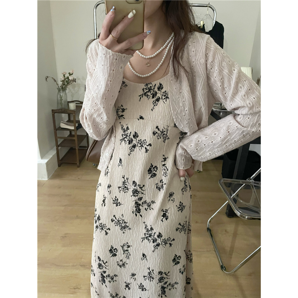 Detail Setelan Wanita Kekinian Import Dress Floral A-line Korean Style/Panjang Cardigan Rajut Crop Top