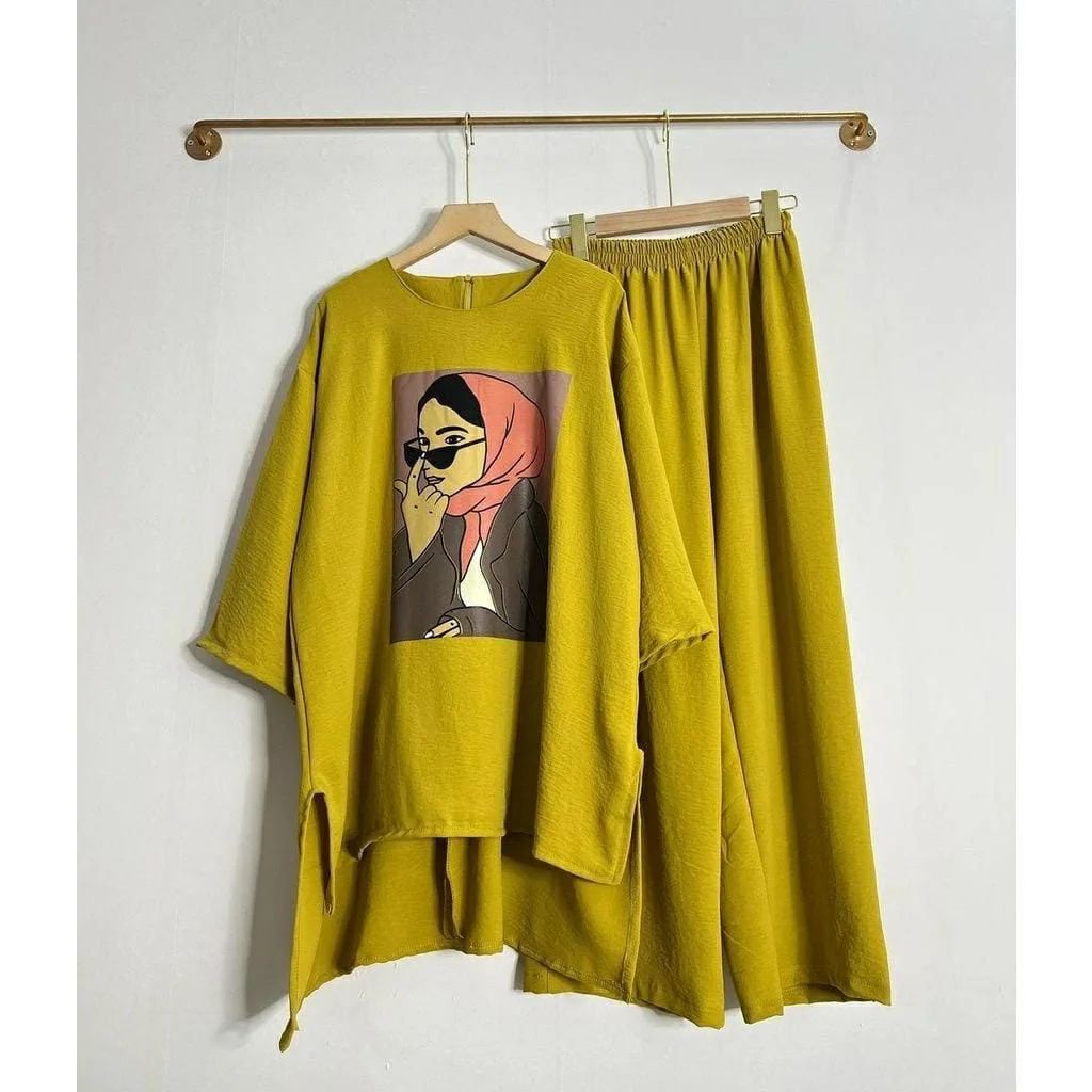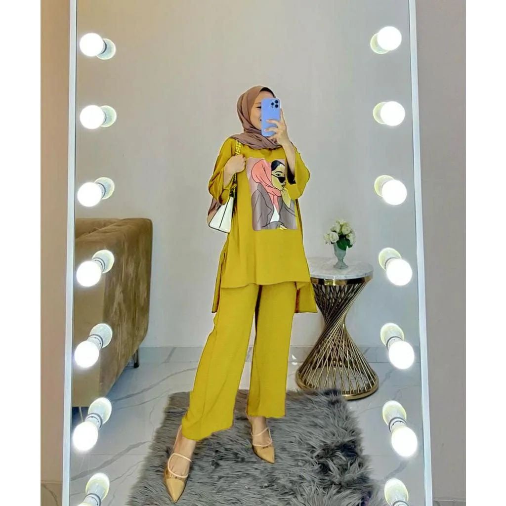 Fashion Muslim > Dress Muslim > Set Baju Muslim > SETELAN WANITA KEKINIAN SORAYA SET BAHAN CRINKLE AIRFLOW MOTIF POLOS APLIKASI SABLON ( DAPAT BAJU + CELANA ) UKURAN M L XL PANJANG BAJU 65 - 75 CM ONE SET WANITA KOREAN STYLE MUSLIM SETELAN WANITA TERBARU 2023 LEBARAN WANITA SET BAJU MUSLIM WANITA