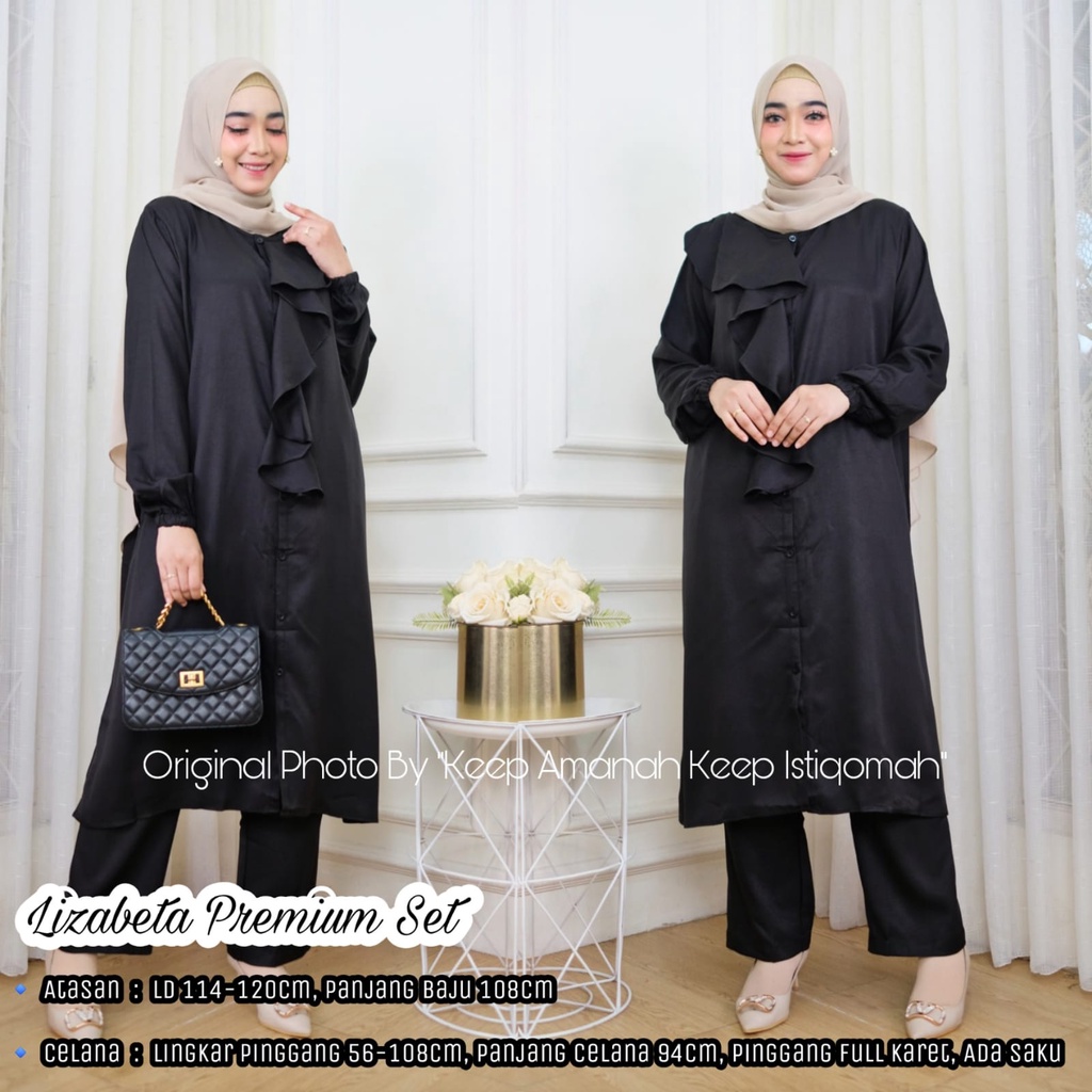 "Lizabeta Premium Set" hadir didesain simple dengan rampel dibagian dada membuat kesan elegan. Lengan kerut (wudhu) friendly dan kancing depan full aktif (busui friendly). bahan Lizabeta Premium Set adalah strech crepe premium, lembut jatuh sehingga membuat nyaman kakak cantik.