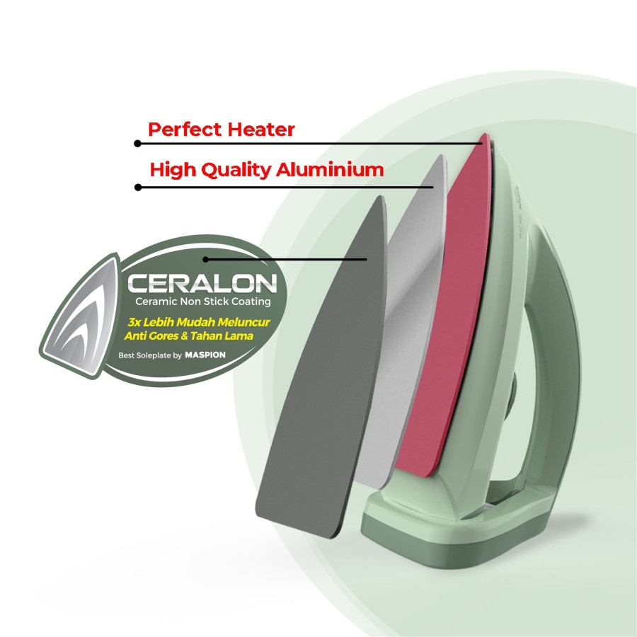 Detail Setrika Maspion HA 365 Hijab Ceramic Coating Gosokan Dry Iron HA-365 Hijab Series Hijau Pink Biru Ungu HA365 Low Watt