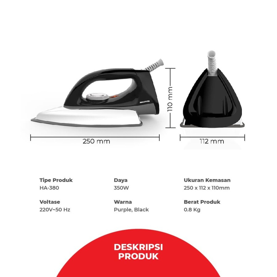 Spesifikasi: - Merek: Maspion - Tipe: HA 380 - Warna: black /purple (wajib dicantumkan di catatan jika request warna tertentu) - Handle : plastic - Sole Plate: Ceramic Coating - Wattage: 350 W / 220 V - Product Dimension : 250x112x110 mm - Weight: 0.8 kg - Inner box: 255x113x123 mm - Garansi Maspion 1 tahun