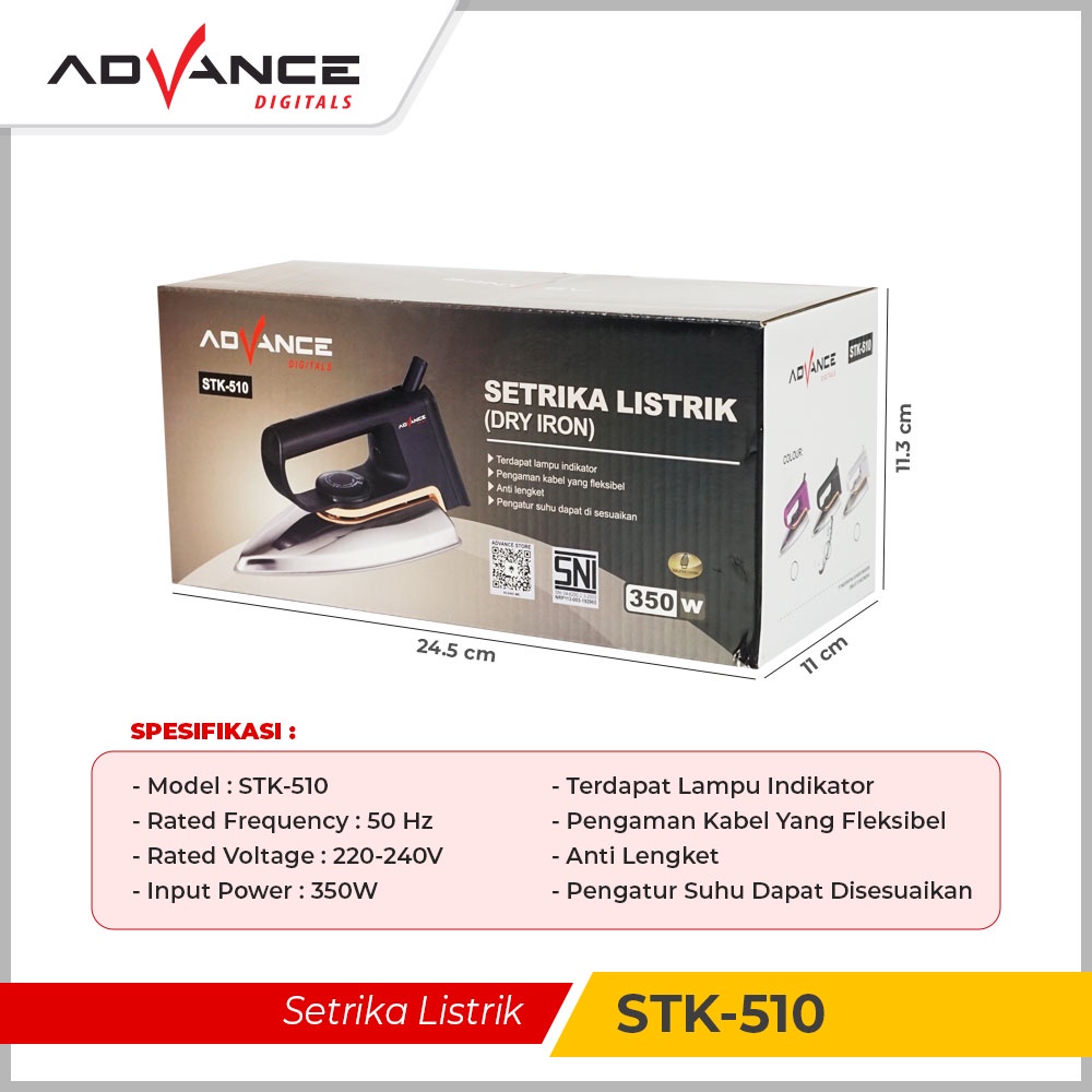 Detail Setrika Uap Listrik Advance (Dry Iron) Anti Lengket STK510 Setrika Listrik hemat listrik 350 W Bergaransi Resmi 1 Tahun