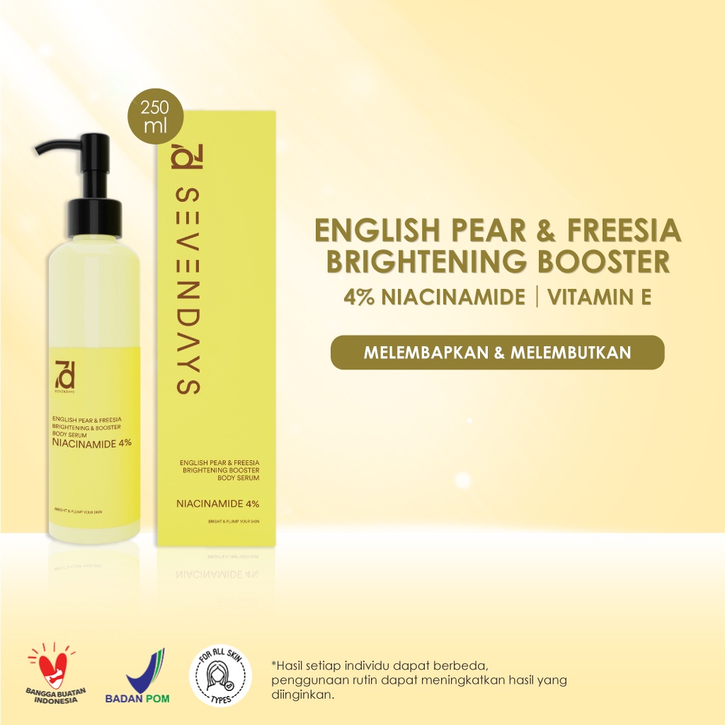 Seven Days English Pear & Freesia Brightening Booster Body Serum ( YELLOW ) 250ML ( 7DBS English P&F ) Seven Days Brightening Body Serum Niacinamide mengandung 4% Niacinamide dan Sodium PCA yaitu perpaduan Vitamin B-3 dan natural moiturizing factor untuk menjaga kecerahan dan kelembapan kulit. Dikombinasikan dengan Marine Collagen dan Vitamin E untuk kelembapan extra di kala kulit dehidrasi dan kering, sekaligus menjaga kekenyalannya.