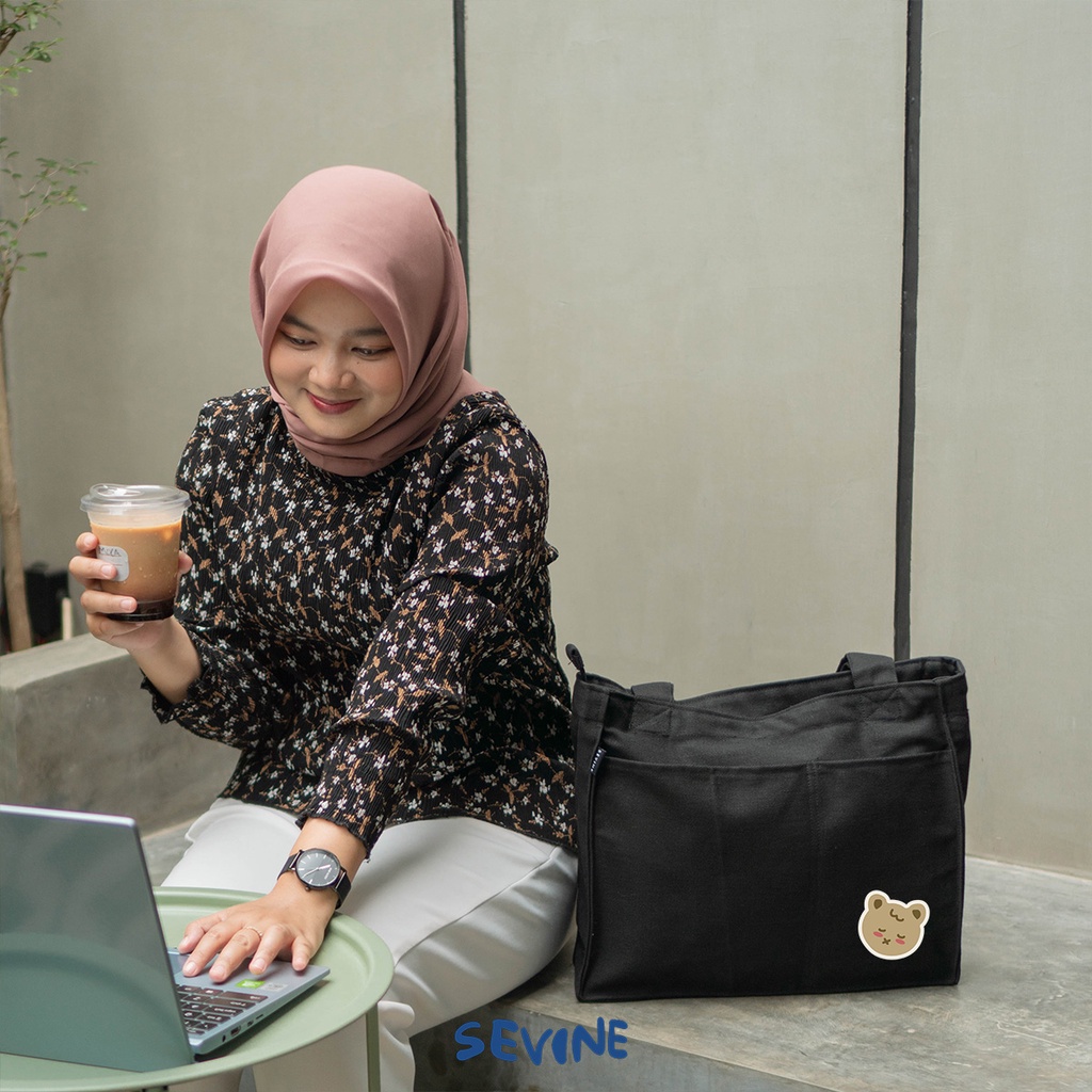 Detail Sevine Totebag Kanvas Rebecca Tas Wanita Tote Bag Kuliah Sekolah Sekat Laptop Hitam Elegan Aesthetic - WP