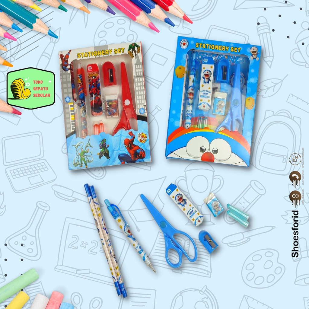Stationery set / Paket Alat tulis / Alat tulis set karakter SP2018 9in1 : 1. 2 pensil 2. 1 penggaris 3. 1 penghapus 4. 1 rautan 5. 2 tutupan pensil 6. 1 pensil mekanik 7. 1 isi pensil 8. 1 gunting ASLI BISA DIPAKAI TAPI BUKAN STAINLESS