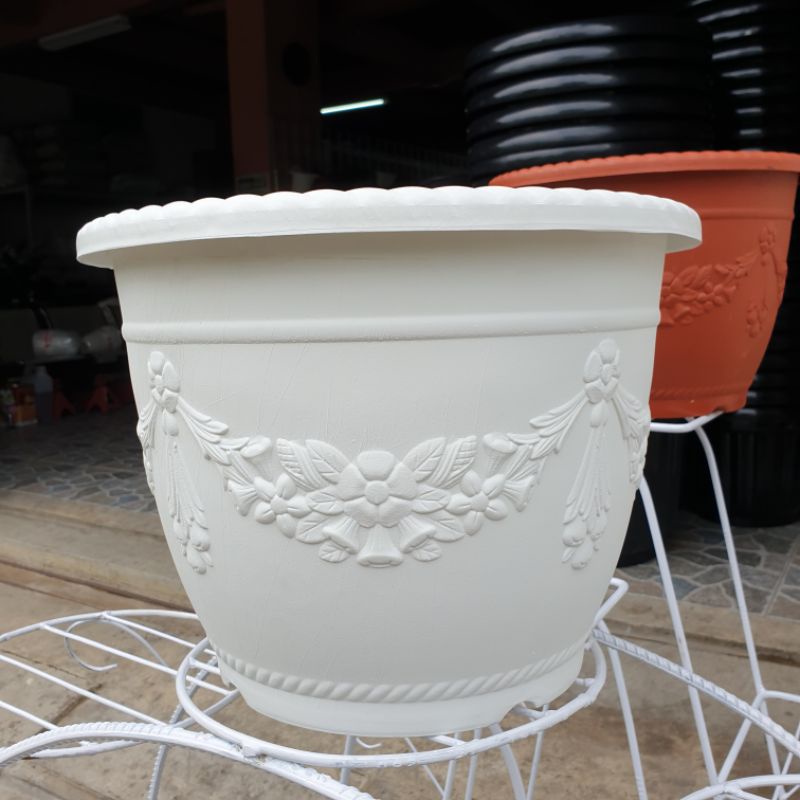 Warna : Putih, hitam dan merah bata Diameter atas 40cm Diameter bawah 26cm Tinggi 31cm Berat 1kg Minimal order 2 pot