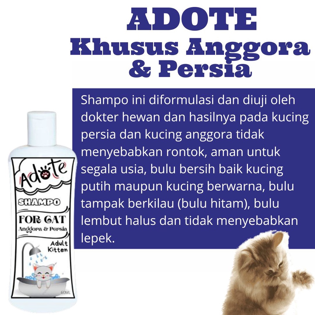 (Untuk kucing yang kotor, larutkan Shampo Adote dengan air hangat dan aplikasikan langsung ke bulu yang masih kering)