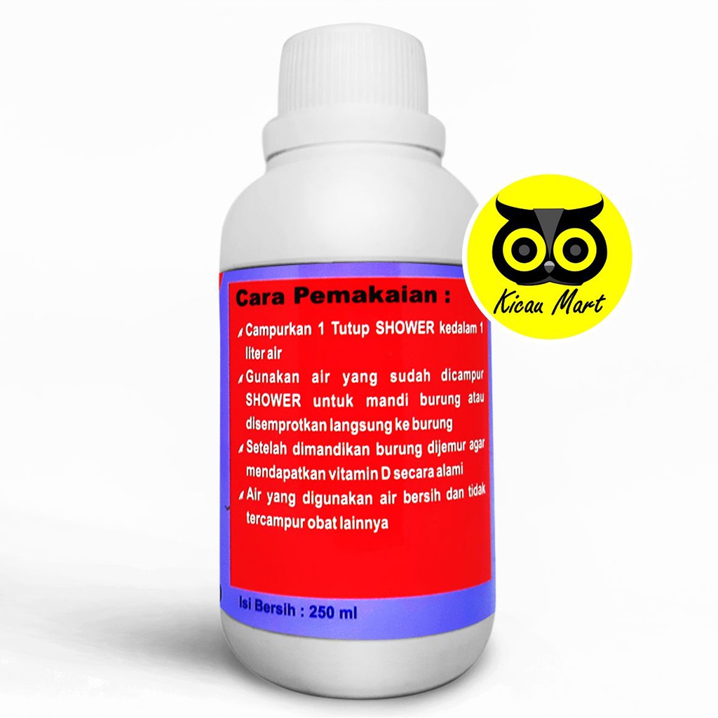 Saran pemakaian : 1. Campurkan 1 tutup Shower kedalam 1 liter air 2. Gunakan air yang sudah di campur shower untuk mandi burung atau di semprotkan langsung ke burung 3. Setelah di mandikan burung di jemur agar mendapat vitamin D secara alami 4. Air yang digunakan harus air bersih dan tidak tercampur obat lainnya