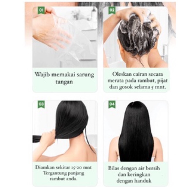 Pemakaian: 1. Rambut dalam keadaan kering, bersih / tidak Ber minyak. 2. Pakai sarung tangan (tersedia dalam box) 3. Tuang shampo secukupnya pada telapak tangan: Rambut Pria: Tekan pompa botol 4 - 6 kali Rambut Wanita (pendek): Tekan pompa botol 6 - 8 kali Rambut Wanita (panjang): Tekan pompa botol 7 - 9 kali 4. Gosok rambut selama beberapa menit dengan air sedikit sampai merata (sama seperti menggunakan shampo biasa) 5. Diamkan selama 15-20 menit (untuk warna Hitam) Diamkan selama 25-30 menit (untuk warna Chestnut Brown, Brown, Wine Red, dsb.) 6. Cuci rambut (tanpa menggunakan shampo) karena pewarna rambut ini sekaligus berfungsi sebagai shampo, TANPA KHAWATIR warna akan yang menempel dikulit kita, seperti pewarna rambut yang lain.