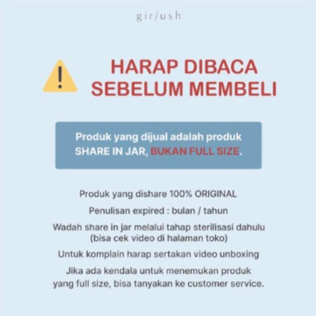 - Produk yang dishare 100% ORIGINAL - Penulisan expired : bulan / tahun - Wadah share in jar melalui tahap sterilisasi dahulu (bisa cek video di hlm toko) - Untuk komplain harap sertakan video unboxing