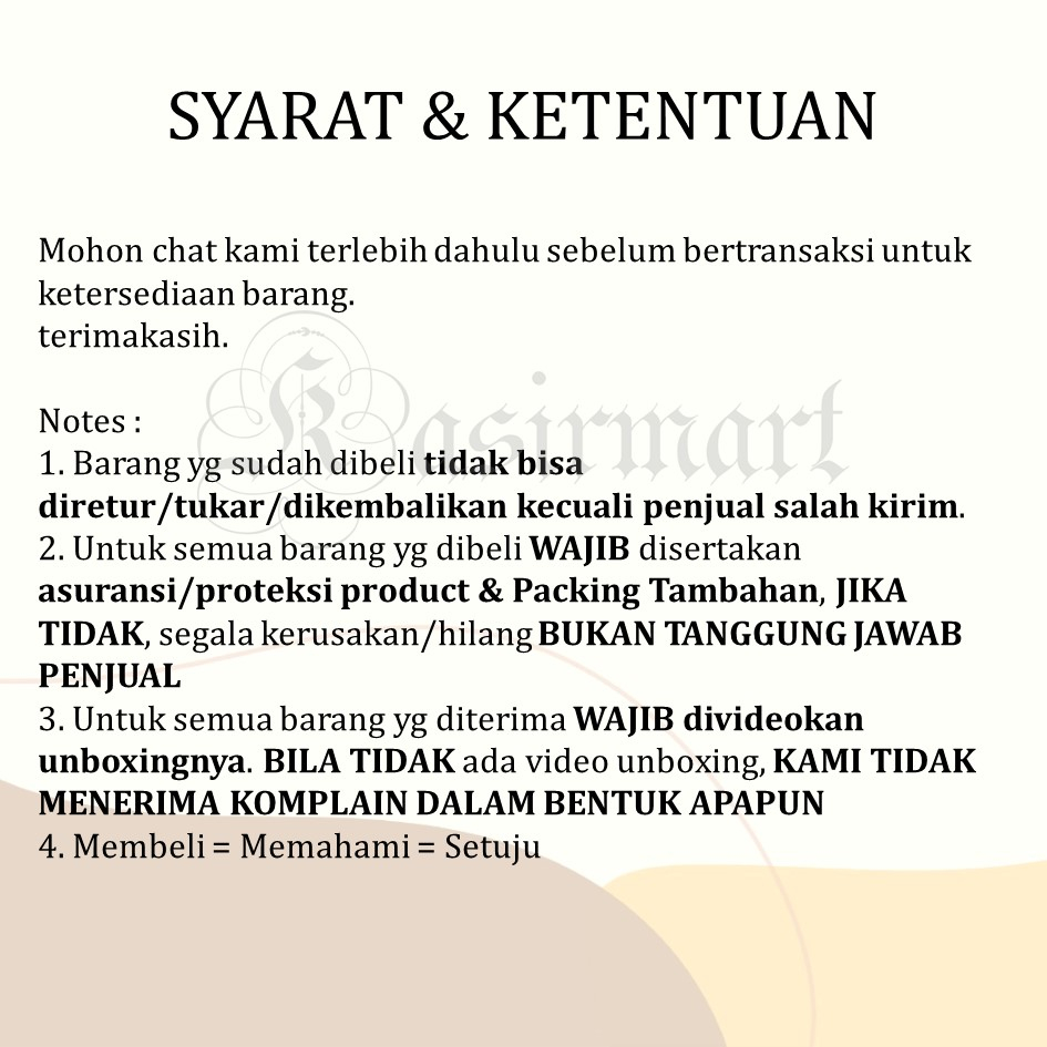 Notes : 1. Barang yg sudah dibeli tidak bisa diretur/tukar/dikembalikan kecuali penjual salah kirim. 2. Untuk semua barang yg dibeli WAJIB disertakan asuransi/proteksi product & Packing Tambahan, jika tidak, Segala kerusakan/hilang BUKAN TANGGUNG JAWAB PENJUAL 3. Untuk semua barang yg diterima wajib divideokan unboxingnya. Bila tidak ada video unboxing, kami tidak menerima komplain dalam bentuk apapun. 4. Membeli = Memahami = Setuju