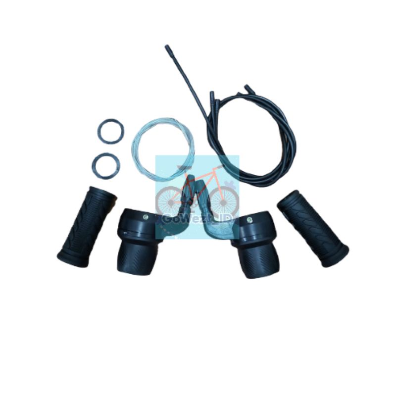 Keterangan : * Merk : GENIO * Model : Putar / Vespa * Bisa untuk 6/7 Speed * Harga Satu Set * Warna Hitam * Termasuk Handgrip, Kabel Luar & Dalam * Cocok untuk semua sepeda yang menggunakan 6/7 Speed * Kualitas Oke