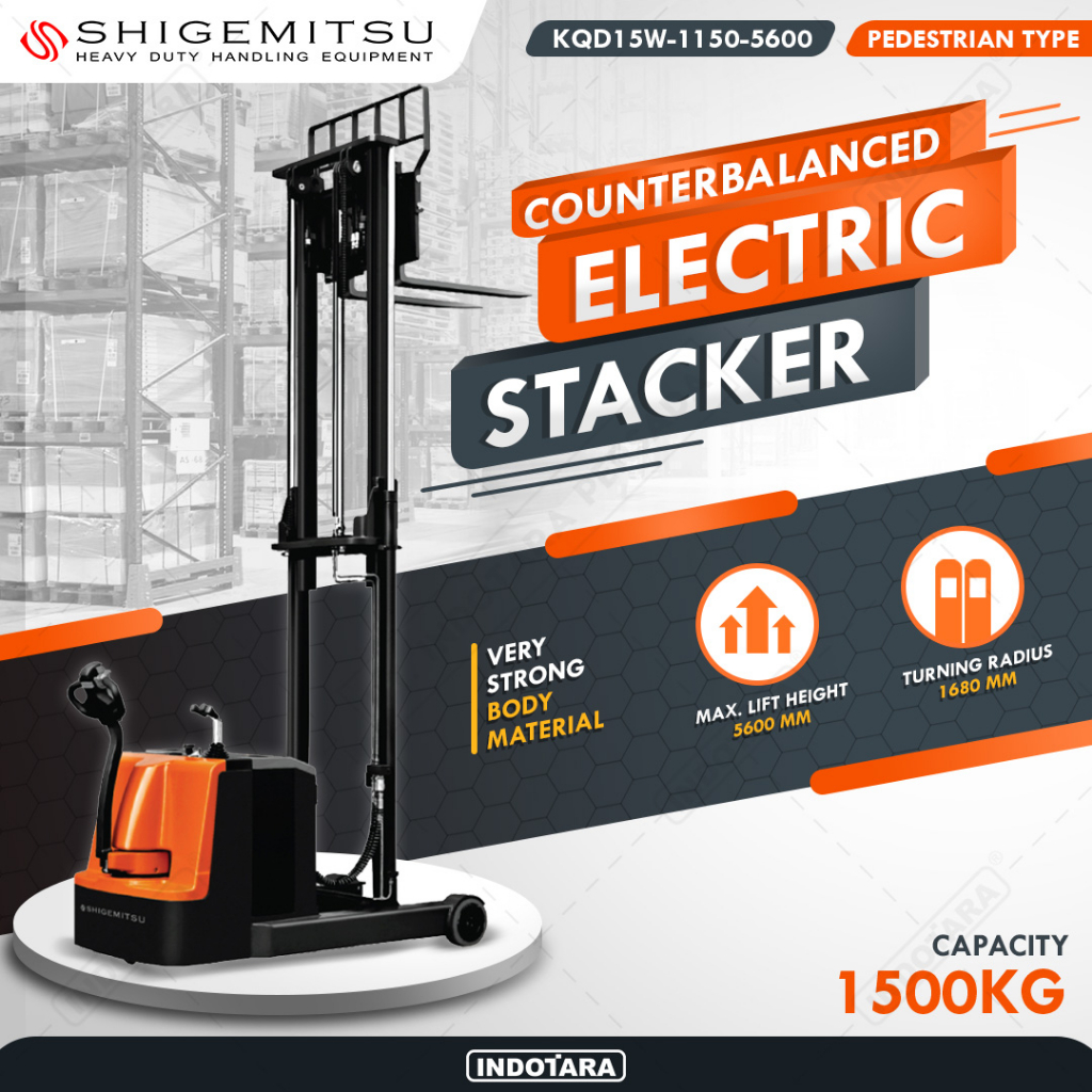 SHIGEMITSU Heavy Duty Class Counterbalanced Electric Reach Stacker Series : KQ Series Type : KQD15W-1150-5600 (PEDESTRIAN TYPE) Capacity / Max. Lift Height : 1500 Kg / 5600 mm • Load center : 500 mm • Load distance : 520 mm • Tyre size, front / rear : Φ250x70 mm / Φ210x85 mm • Balance wheel size : Φ127x57 • Forks, tilt forward/backward : 3°/6° • Height, mast lowered / extended : 2495 / 6600 mm • Free lift : 1870 mm • Height of tiler in drive position min./max : 570/1320 mm • Overall length : 2130 mm • Length to face of fork : 1180 mm • Overall width : 990 mm • Fork dimensions : 35x100x1150 mm • Fork carriage width : 220-680 mm • Reach distance : 650 mm • Aisle width for pallets 800x1200 lengthways : 2720 mm • Turning radius : 1680 mm • Travel speed, laden/unladen : 5.5/6 Km/h • Lift speed, laden/unladen : 0-0.13/0-0.16 m/s • Lowering speed : 0-0.45 m/s • Battery voltage : 24/270 V/Ah • Service weight (with battery) : 1980 Kg