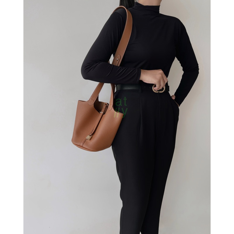 Bahan Kulit sintetis premium, bertekstur kulit jeruk Lembut, tidak meninggalkan bekas lipatan. Termasuk pouch kecil bahan parasut (16x 8x 14cm) Bonus: kain Twilly dan Bag charm (warna random) Ukuran tas: Bukaan atas: 31cm Dasar tas: 16x 20cm Tinggi tas: 20cm Kunci hanya dekorasi