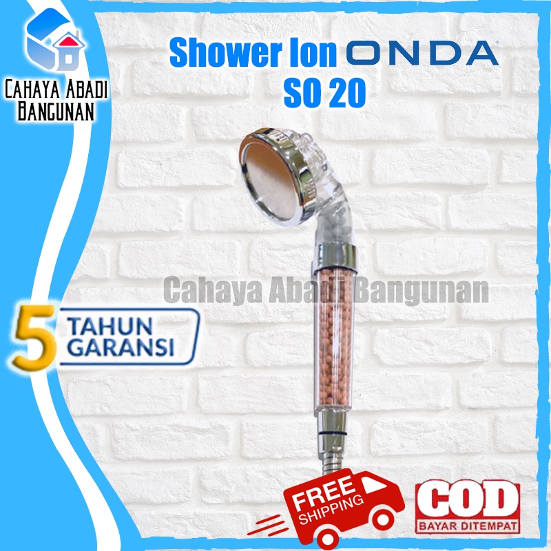 Keunggulan Shower Ion ONDA SO 20 1. Bergaransi 5 Tahun. Satu2nya Shower Ion yang memberikan garansi bahkan sampai 5 tahun 2. Memiliki 3 Jenis Keluaran air yang bisa disesuaikan dengan selera 3. Memiliki infrared ball untuk melepaskan ion negatif yang ada dalam tubuh 4. Memiliki carbon ball untuk membantu mengecilkan molekul air agar mudah diserap oleh kulit 5. Keluaran air yang kencang 6. Lubang keluaran air sangat kecil sehingga menghemat persentase pengeluaran air. 7. FREE refill bola ion senilai 25RB 8. Sudah 1 Set dengan Selang Fleksible Kuningan ONDA