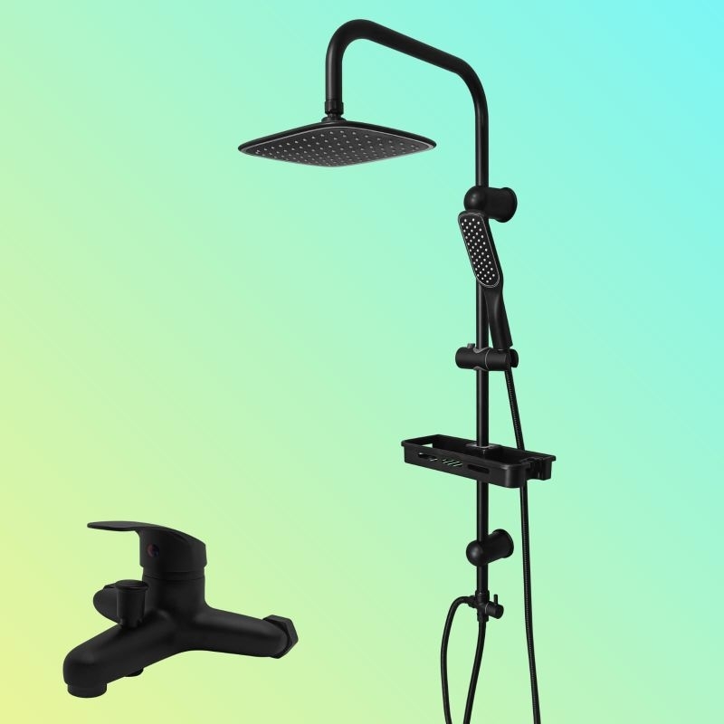 Terdiri dari varian Black series shower tiang stenlies panjang 80cm wall shower 8 inchi PVC Hand shower mandi PVC Rak sabun PVC kran panas dingin selang shower 150cm selang sambungan ke kran 30cm