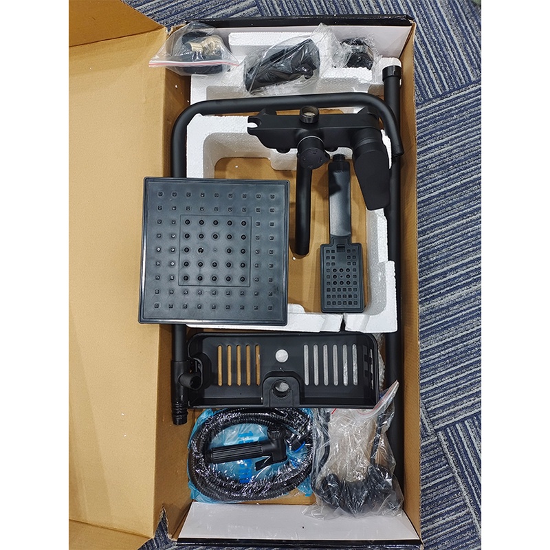peralatan: 1 set batang shower minimalis hitam tembaga 1 set kran bodi utama saklar empat tombol tembaga 1 kepala pancuran di atas kepala 1 kepala pancuran tangan 1 alat penyiram tangan 1 rak penyimpanan sabun 1 buah selang ukuran 150 cm Termasuk baut untuk pemasangan.