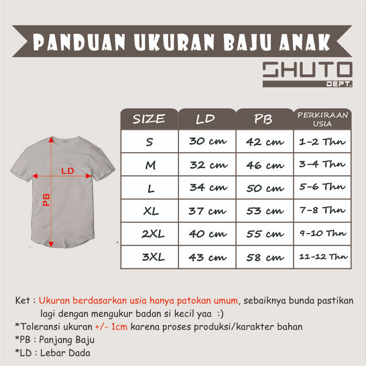 KETERANGAN : * LD : Lebar Dada, PB : Panjang Badan * Ukuran berdasarkan usia hanya sebagai patokan umum, sebaiknya bunda pastikan lagi dengan mengukur badan si kecil yaa... * Toleransi ukuran +/- 1cm karena proses produksi ya Bun...