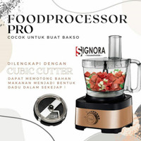 SIGNORA FOOD PROCESSOR PRO DENGAN CUBIC CUTTER Fungsi : Shredding and Slicing Baldes 1. Potong Halus - Cocok untuk Salad 2. Potong Kasar - Cocok untuk isi Lumpia 3. Potong Tebal - Cocok untuk Kentang Goreng, Ubi Goreng 4. Power : 800 watt 5. Kapasitas daging : 500-700 gr 6. Kapasitas gelas : 3,5 ltr 7. Adonan donat/mie : 250gr