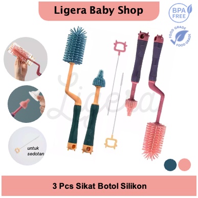 KEUNGGULAN: 1. Set 3 in 1 2. Berkualitas tinggi, dibuat dari bahan silicon food grade, BPA free, anti bakteri 3. Bahan yang lembut untuk mencegah permukaan botol tergores 4. Membuat botol dan nipple lebih awet 5. Gagang dapat berputar 360° sehingga dapat membersihkan semua kotoran dengan mudah 6. Mudah dibersihkan, tidak berjamur, tidak berubah bentuk, cepat kering setelah pemakaian 7. Tahan lama, ringan, fleksibel 8. Ukuran compact, kepala sikat dapat dilepas pasang, praktis dibawa2 dalam diaper bag 9. Ramah lingkungan 10. Dapat disteril dengan suhu tinggi