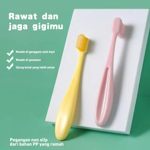 Keunggulan Produk: - Permukaan sikat rata, dan bagian atas bulunya bundar - Bulu sikat lembut agar tidak melukai gusi anak