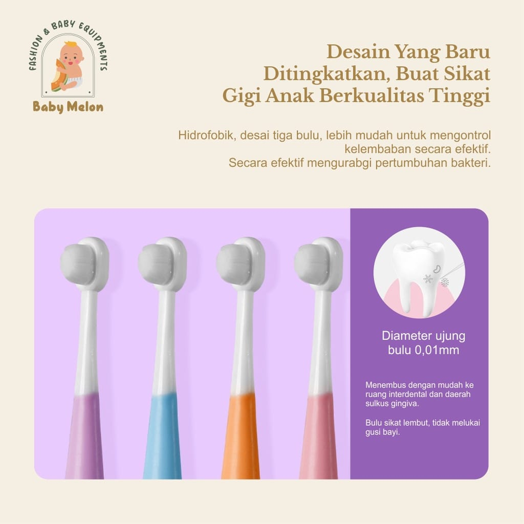Fitur: ~ Sikat gigi anak dengan teknologi jepang menciptakan 20.000 bulu sikat yang halus dan dapat membersihkan ke celah-celah gusi dan gigi sementara sikat normal hanya punya 700-1000 bulu sikat, jadi bersihnya sebanding dengan 20x sikat gigi. ~ Mengurangi resiko gusi berdarah pada anak. ~ Tidak melukai gusi anak ~ Cocok untuk 1 tahun keatas