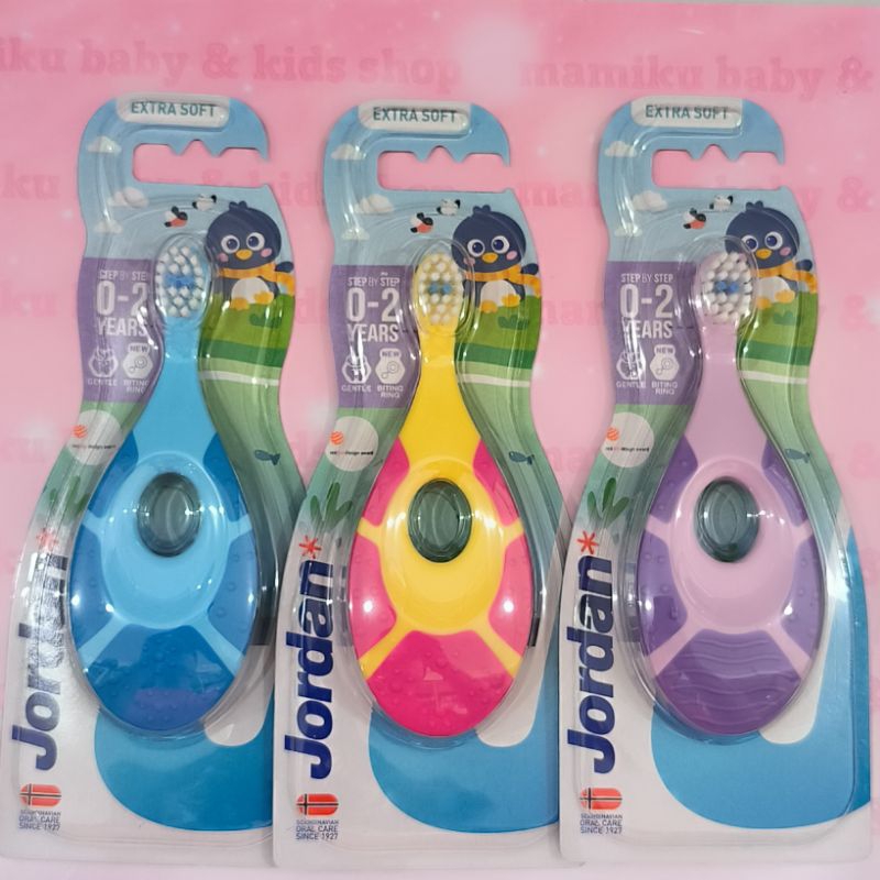 Bulu Sikat: Super Soft/ Sangat Lembut Kepala Sikat: Small/Kecil • Untuk anak usia 0-2 tahun • Terdapat lubang pada gagang sikat, sehingga mudah digenggam oleh anak-anak maupun orang tua • Terdapat bagian khusus pada gagang sikat yang bisa digigit anak-anak untuk dapat memijat gusi dan juga melatih otot rahang anak • Leher sikat yang pendek dapat mencegah tersedak • Bulu sikat yang sangat halus mampu membersihkan gigi anak-anak dengan lembut • Terdapat bulu sikat berwarna biru sebagai takaran penggunaan pasta gigi Jordan Kids Step 1 yang hanya berupa 1 goresan tipis dan pendek (Pasta gigi dijual terpisah)