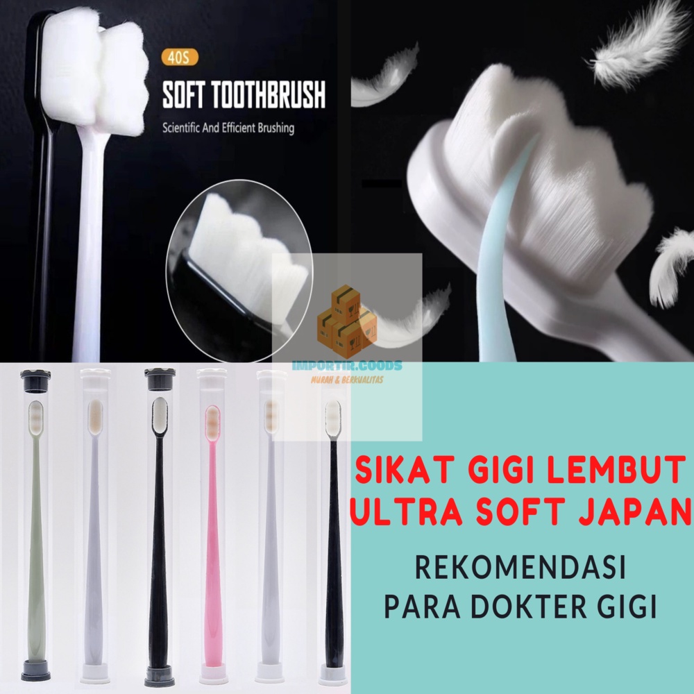 bahan > 10 ribu serat fiber nano ultra soft ramping ukuran 70-100 micron, anti bakterial, sangat efektif utk membersihkan gigi dengan manfaat : - tidak menimbulkan rasa sakit, iritasi, dan gusi berdarah - tidak merusak gusi dan enamel gigi - mampu menjangkau dan membersihkan sampai keseluruh bagian gigi - Bagian Belakang kepala sikat berfungsi untuk pembersih lidah