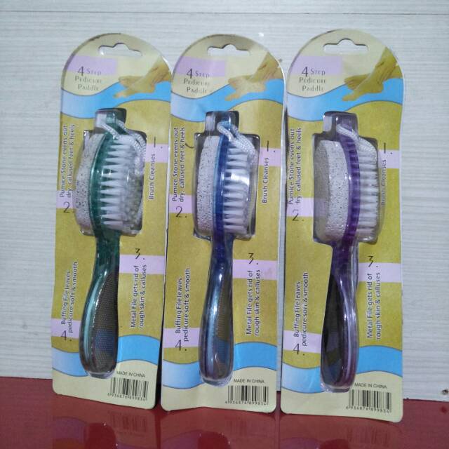 Sikat Pembersih Kaki 4 Fungsi Alat komplit untuk merawat kaki anda, dengan 4 sikat berbeda : (1) Sikat biasa untuk membersihkan kotoran kasar di kaki dan kuku (2) batu gosok untuk membuang kulit mati (3) sikat logam untuk membersihkan kulit keras, dan (4) penghalus kulit