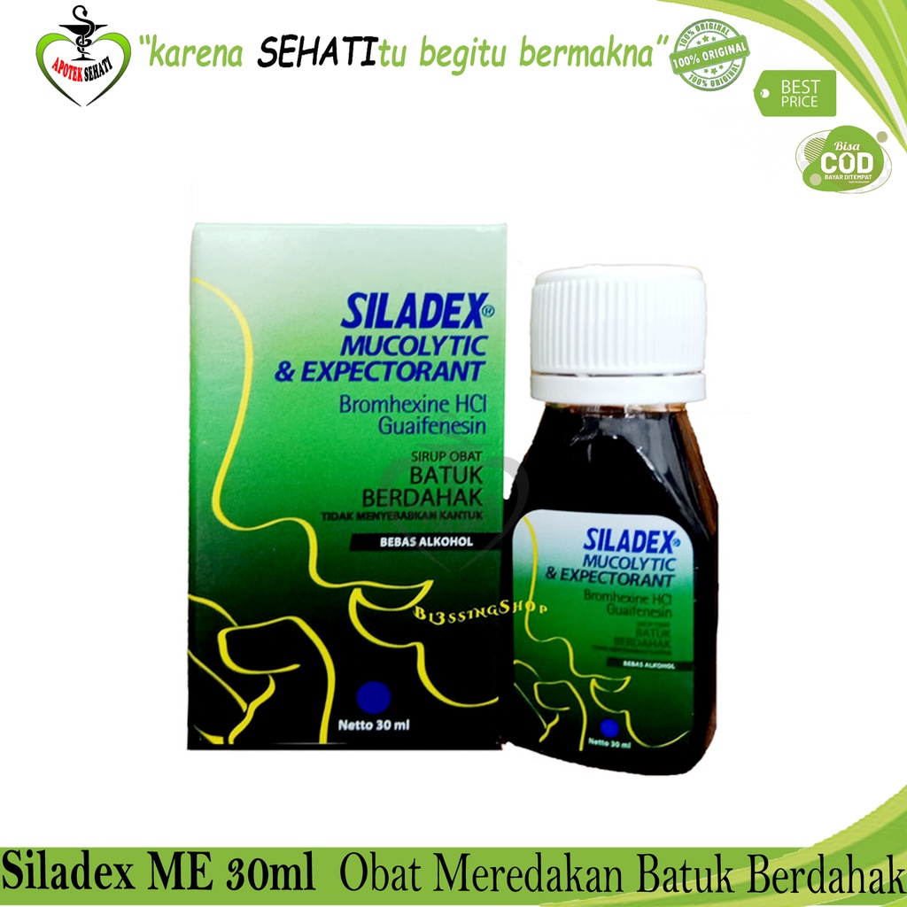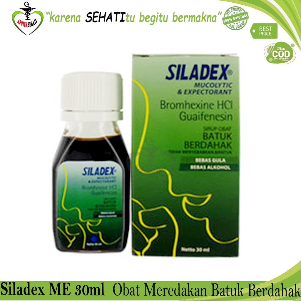 SILADEX MUCOLIYTIC EXPECTORANT berfungsi mengencerkan dahak dan membantu mengeluarkan dahak dari saluran pernapasa yang disebabkan oleh dahak yang berlebihan. Aman digunakan untuk penderita diabetes. Indikasi Umum Sebagai mukolitik dan ekspektoran untuk meredakan batuk berdahak dan mempermudah pengeluaran dahak Dosis Dewasa dan anak di atas 10 tahun: sehari 3 x 1 sdtk. Anak 5-10 tahun sehari 3 x 1/2 sdtk Aturan Pakai Sesudah makan Kontra Indikasi Hipersensitif terhadap komponen dalam obat ini Efek Samping Mual, diare, rasa penuh diperut, vertigo, berkeringat lebih banyak, dan ruam kulit Kemasan Botol @ 30 ml, 60 ml dan 100 ml Manufaktur Konimex No. Registrasi BPOM: DTL9913018437A1