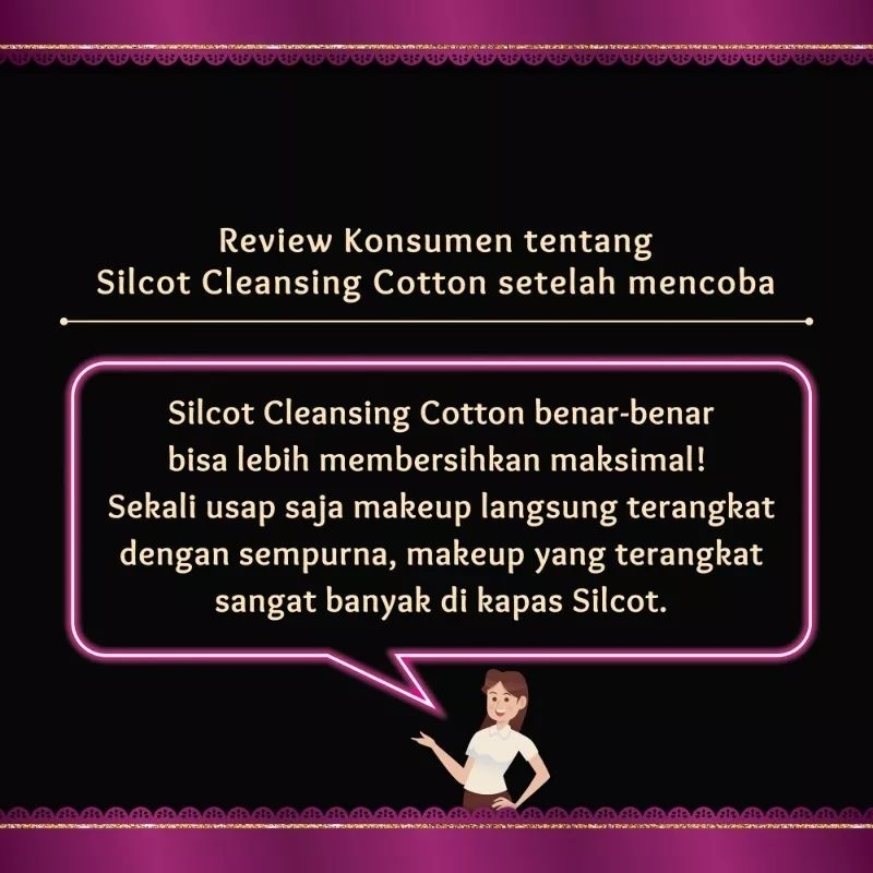 Silcot Cleansing Cotton adalah kapas dengan Teknologi Moist Cleansing Fiber yang mampu menyebarkan cairan remover secara merata sehingga efektif untuk membersihkan makeup tanpa diseka berulang kali. Bentuk kapas menyerupai pouch sehingga tidak akan ada serat yang keluar dari permukaan atau samping kapas. Mengandung bahan yang lembut di kulit sehingga kulit akan tetap terasa lembut setelah membersihkan makeup.